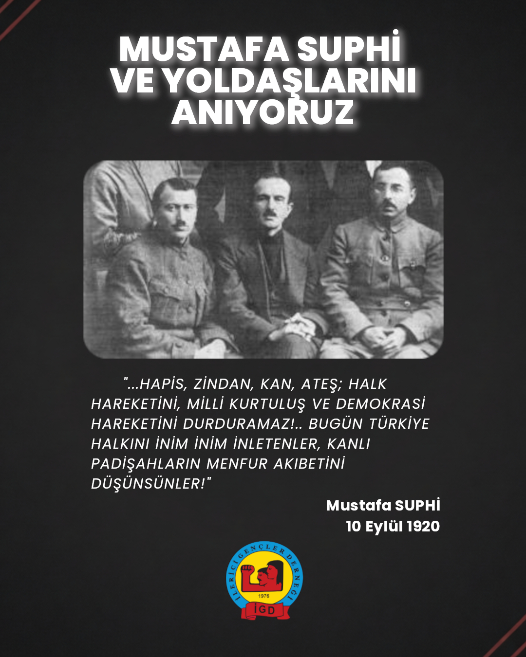 Kurtuluş Savaşı’nın ateşleri içinde, Büyük Ekim Sosyalist Devrimi’nin çağ açıcı etkisiyle 10 Eylül 1920’de Türkiye Komünist Partisi’ni kuran Mustafa Suphi, Ethem Nejat ve 13 yoldaşı; Kurtuluş Savaşı’na doğrudan katılmak, emekçi halkın bağımsızlık ve özgürlük mücadelesini bu topraklarda büyütmek için yurda dönerken Karadeniz’de kalleşçe katledildi. Bu katliamda yaşamını yitiren onbeşleri saygıyla anıyoruz.
